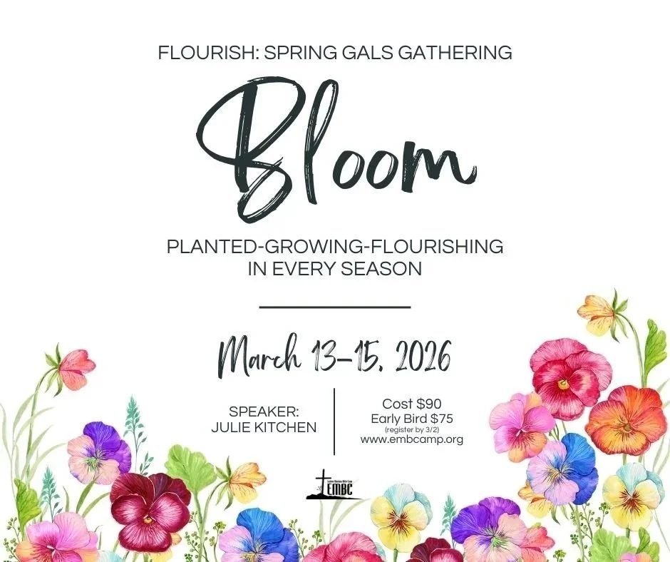 A spring retreat for all ages. Pack your bags and join us for our Spring Gals Gathering where Julie will share her wisdom on blooming in every season of life with Jesus right beside you!